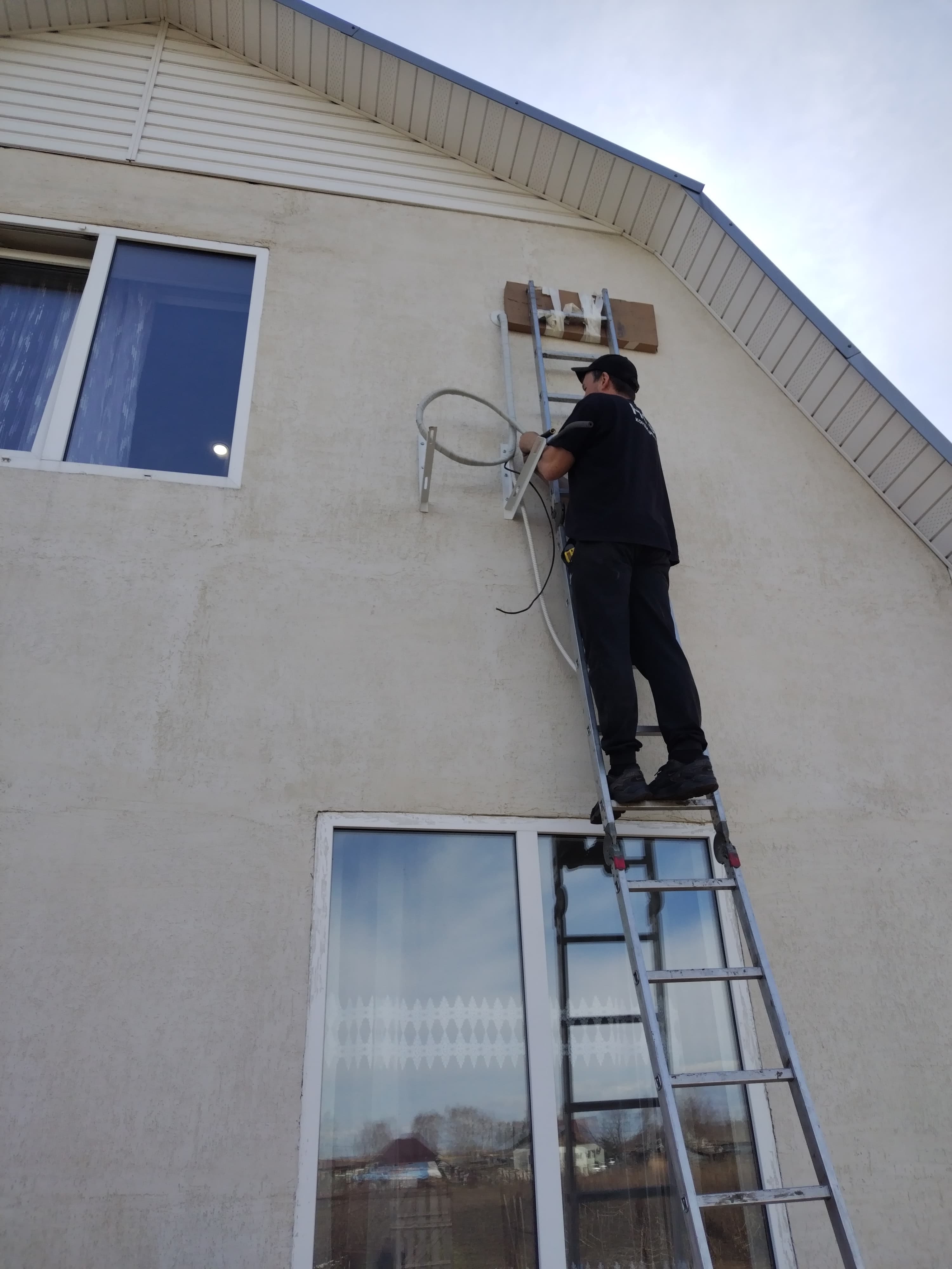 При выполнении работ наша бригада использовала лестницу. Работа на такой высоте с лестницей сопряжена с повышенной опасностью из-за риска раскачивания конструкции при перемещении тяжелого блока (вес наружного блока составляет около 30-35 кг) и необходимости сверления отверстий в сибите. В отличие от монтажа с фасадной вышки или автовышки, использование лестницы в данном случае увеличило трудозатраты и требования к страховке персонала.