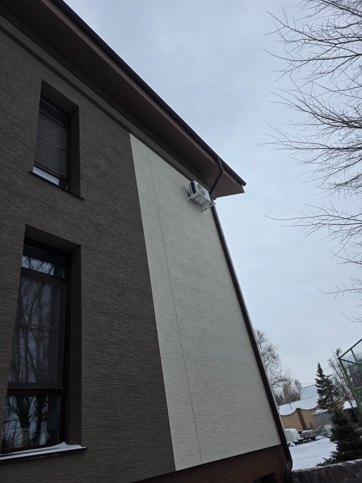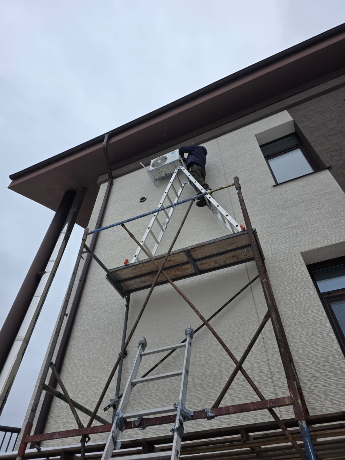 Наружные блоки сплит-систем были надежно закреплены на фасаде здания с использованием кронштейнов, рассчитанных на повышенные ветровые и весовые нагрузки. На данном этапе блоки были установлены с частичным подключением, ожидая окончательных работ по коммуникациям.