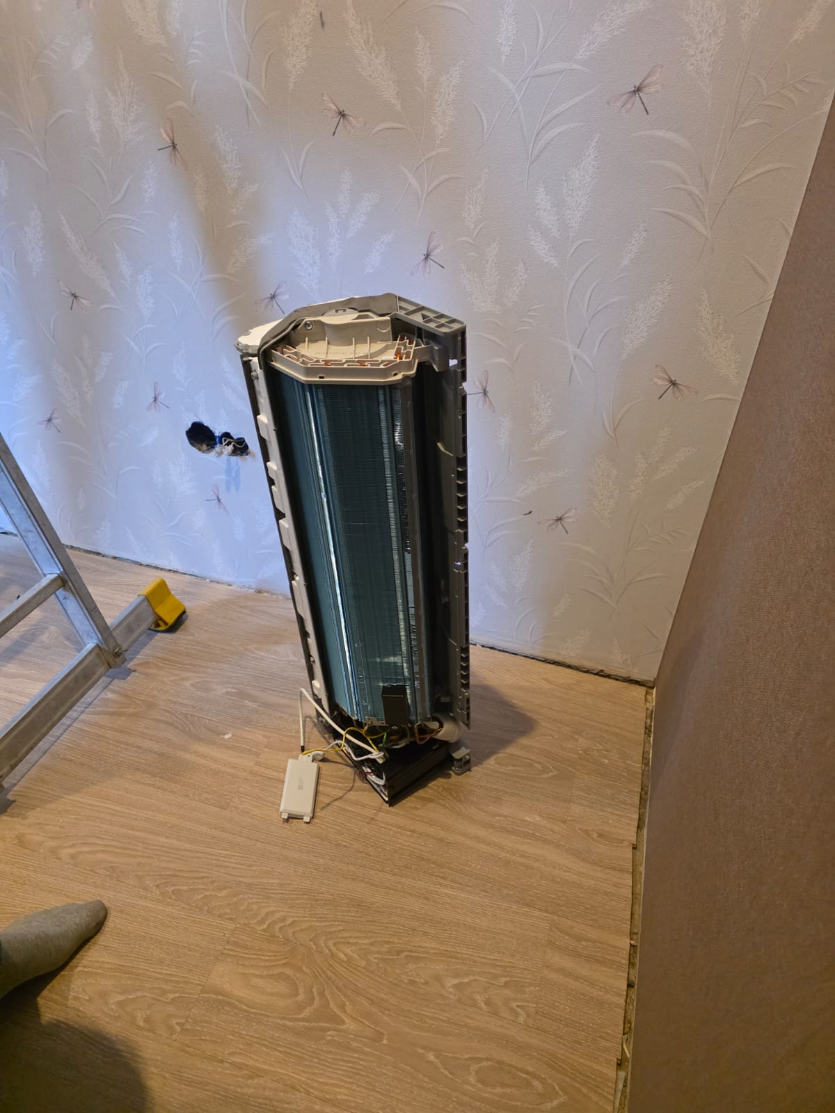 Внутренние блоки устанавливались по схеме «один к одному» со скрытой прокладкой трасс. Для корректного подключения к заранее выведенным кабельным линиям питания и управления наши мастера выполнили демонтаж лицевых панелей и корпусов блоков. Это позволило обеспечить точное и аккуратное соединение всех электрических и коммуникационных линий.