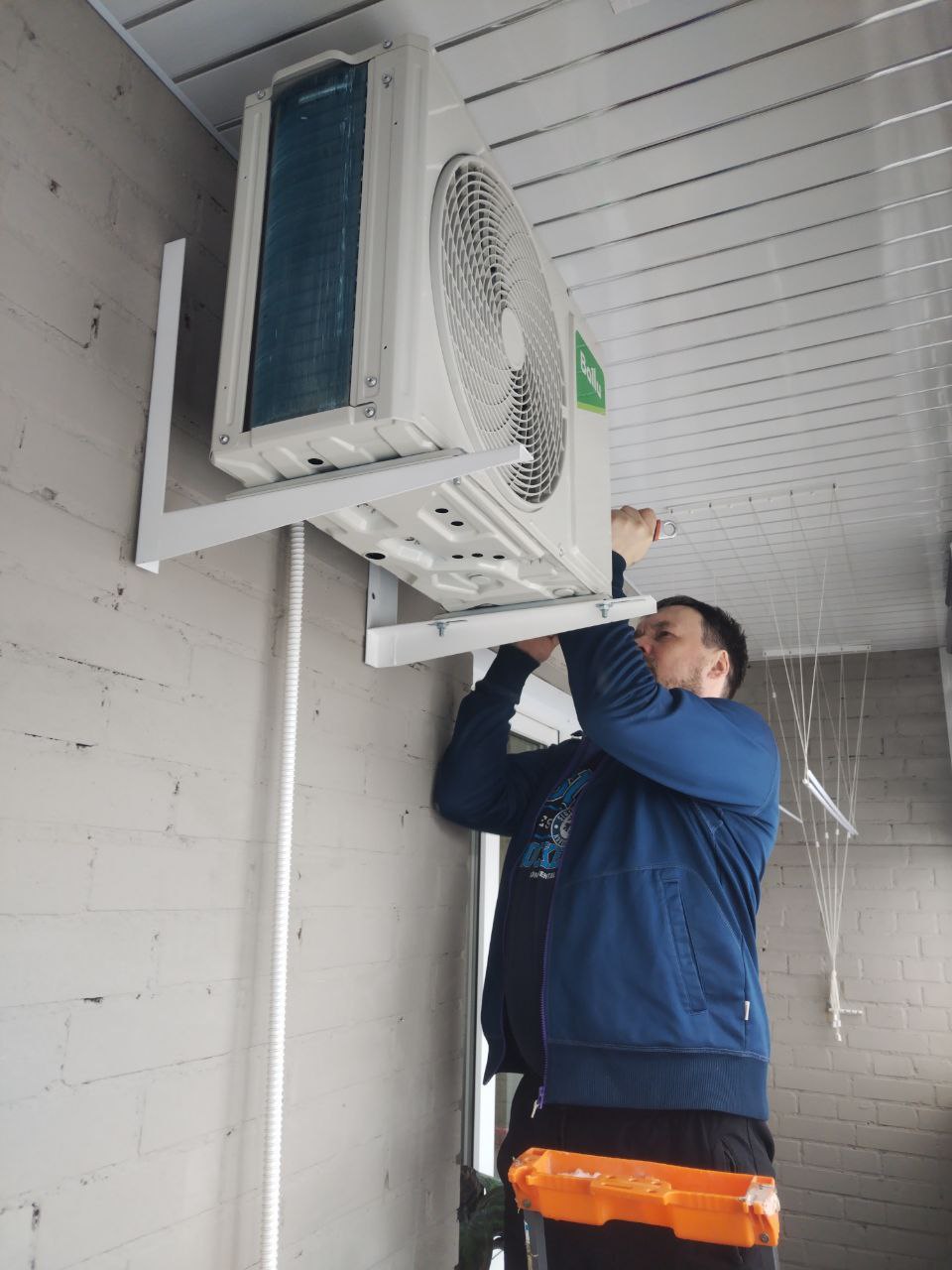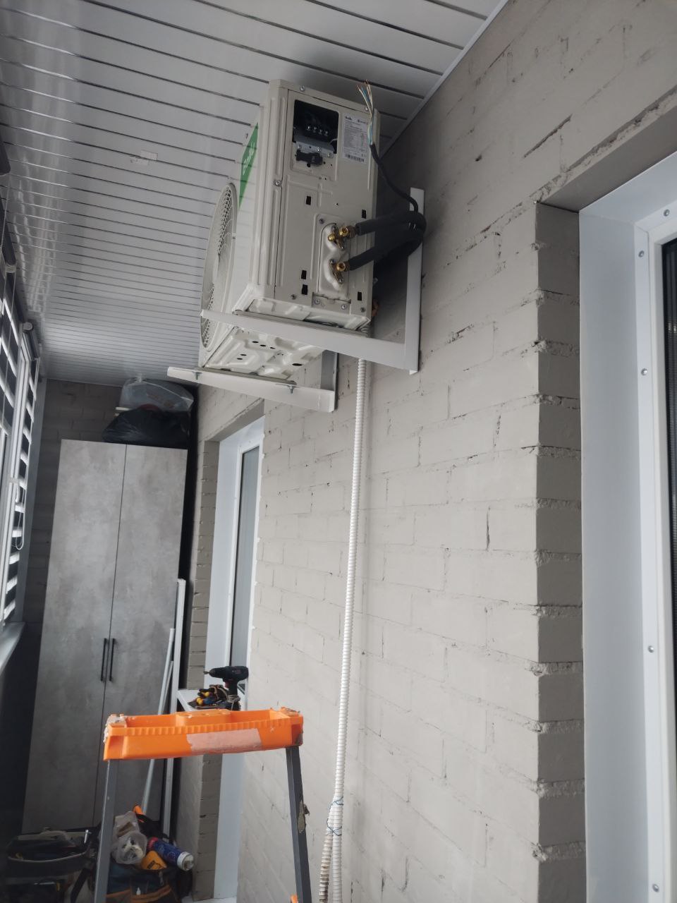 После завершения демонтажных работ был выполнен монтаж наружного блока за балкон - на внешней стене здания. Такое расположение является правильным с технической точки зрения. Наружный блок, установленный на внешней стене, получает беспрепятственный доступ к свежему воздуху, что обеспечивает эффективное охлаждение радиатора и стабильную работу компрессора. Кроме того, вынос блока за пределы балкона полностью исключает передачу шума и вибрации в жилое помещение, а также предотвращает нагрев остекленной лоджии. Стоимость установки наружного блока за балкон составила 2000 рублей.