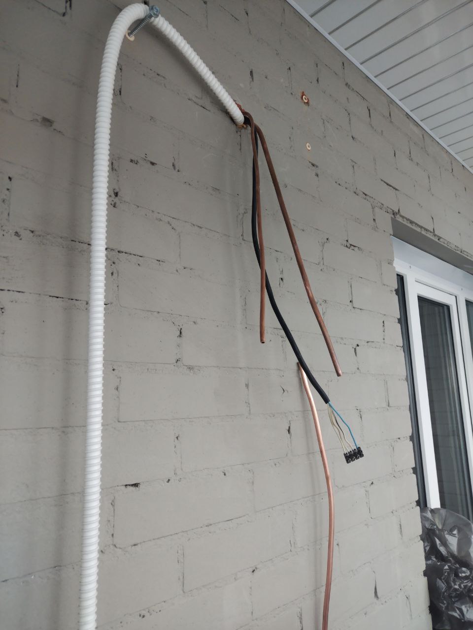 В процессе переноса наружного блока за балкон возникла необходимость значительного удлинения межблочной трассы. Изначально медные трубы были рассчитаны на короткое расстояние, так как блок стоял непосредственно на балконе. Для корректного размещения блока на внешней стене потребовалось удлинение фреоновой магистрали на 7,5 метров. Увеличение длины трассы требует точного расчета и профессионального исполнения, так как от герметичности соединений и правильности пайки зависит работоспособность всей сплит-системы.