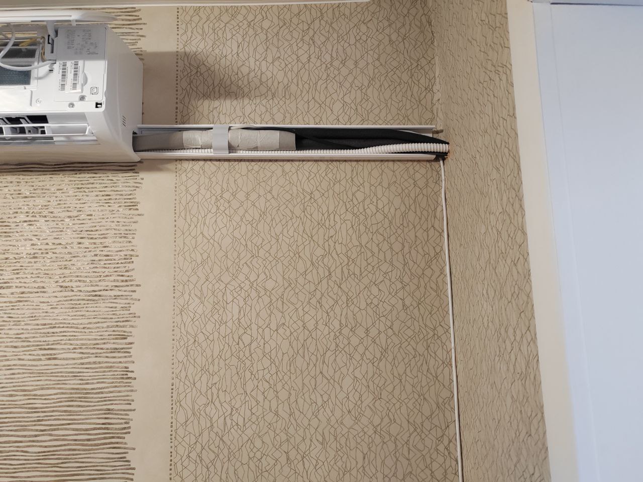 – Прокладка межблочной трассы (медные трубы в теплоизоляции, дренажный шланг, межблочный кабель) в подготовленном штробе или кабель-канале.