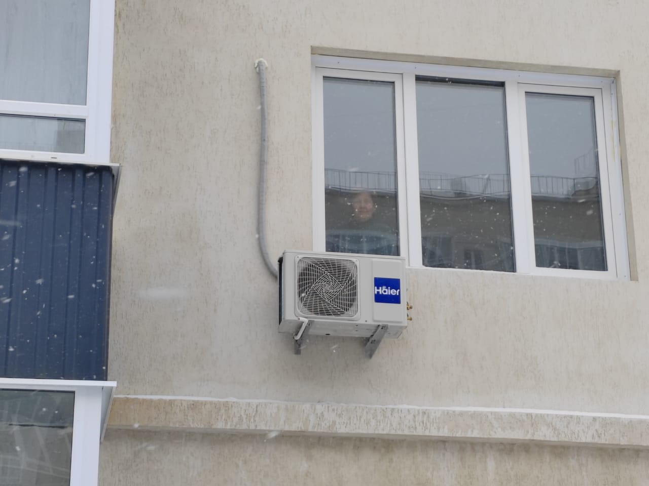 • Крепление внешнего блока: Фасад здания был отделан пенопластом с последующим оштукатуриванием по армирующей сетке. Для обеспечения максимально надежной и безопасной фиксации тяжелого оборудования наши мастера использовали технологию крепления на латунные закладные шпильки. Данный метод позволяет равномерно распределить нагрузку и обеспечивает прочное соединение с несущей стеной, минуя слой утеплителя.