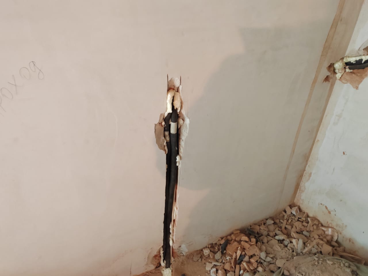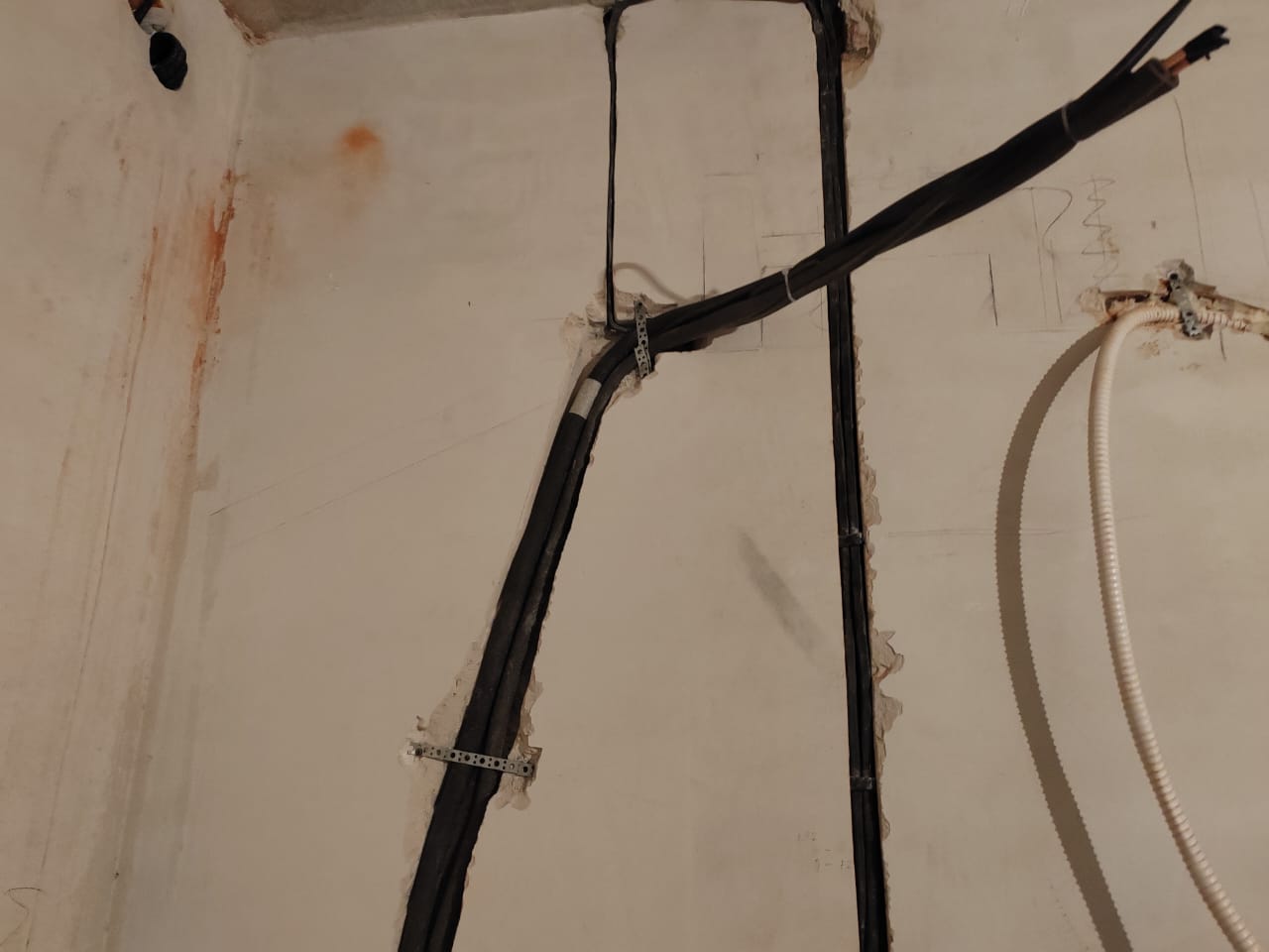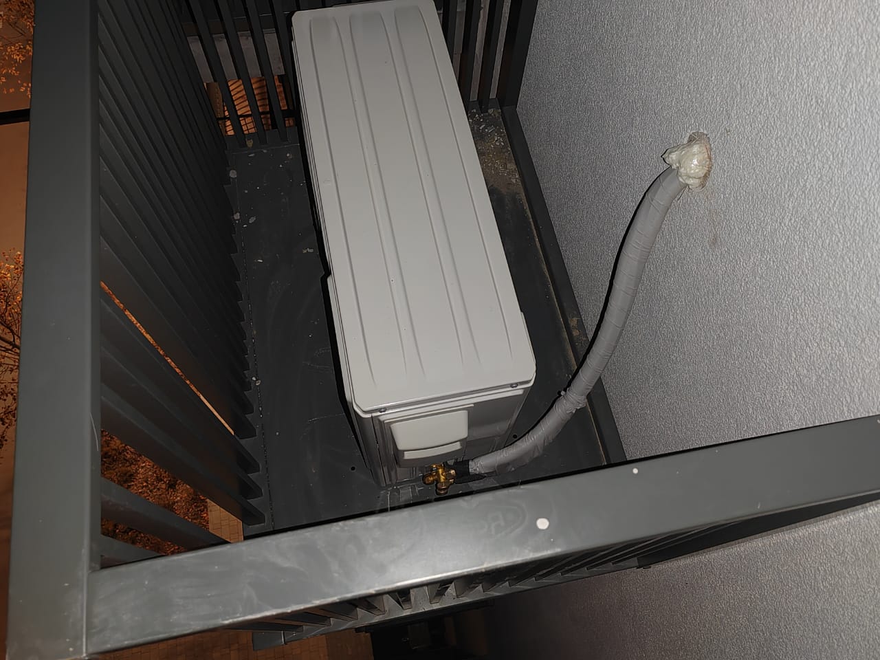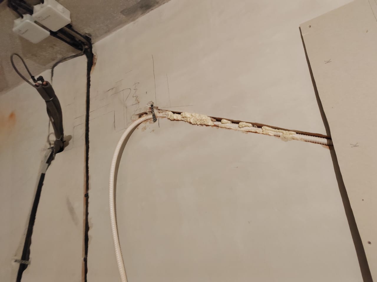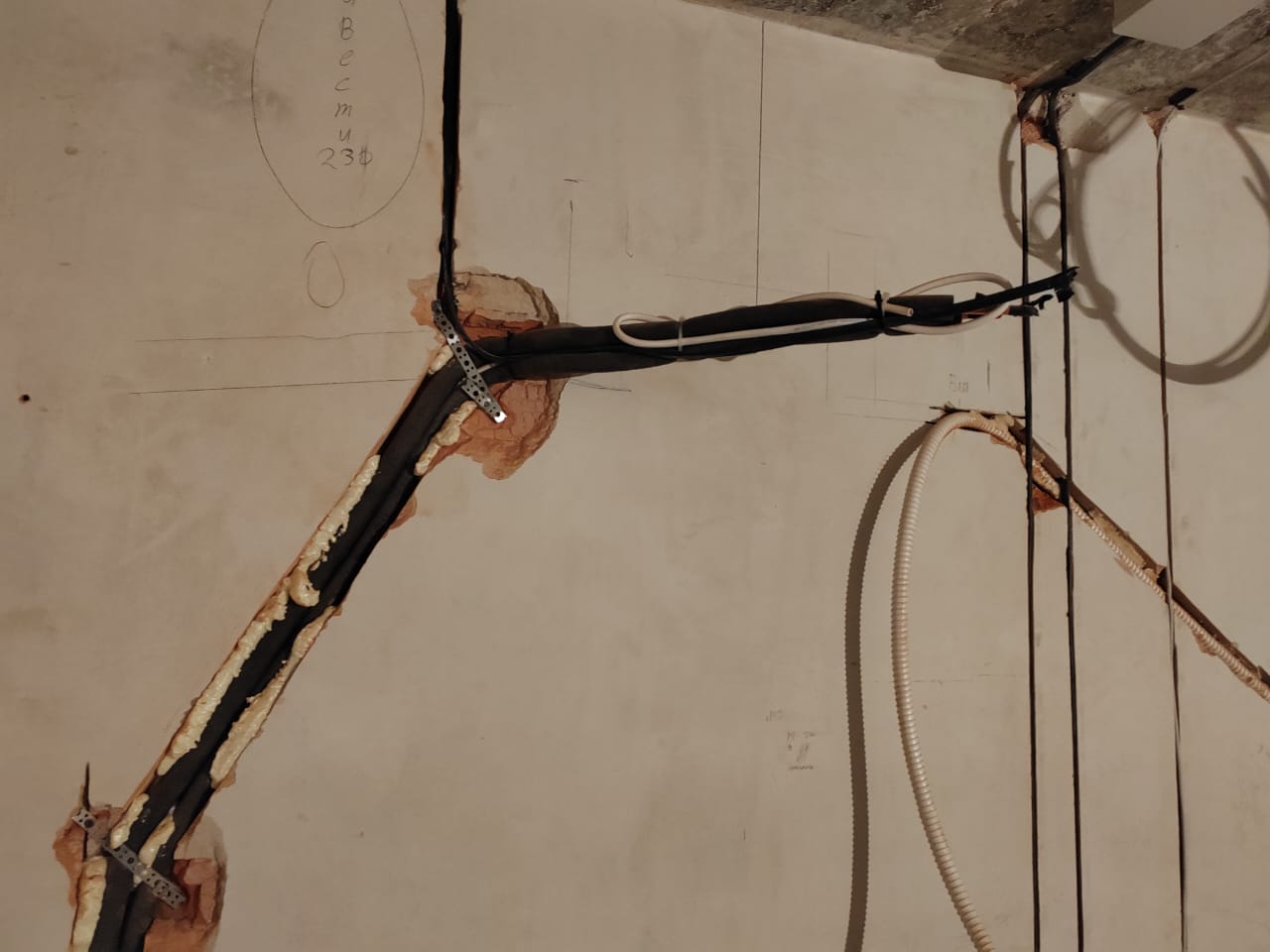 На подготовительном этапе, до начала финишной отделки помещений, было проведено штробление стен для аккуратной укладки межблочных коммуникаций и дренажной системы. Важным техническим решением, предложенным и реализованным нашими инженерами, стала организация отвода конденсата не на фасад, а в общую канализационную систему здания. Это решение исключает риск образования наледи на фасаде и обеспечивает эстетичный внешний вид здания.